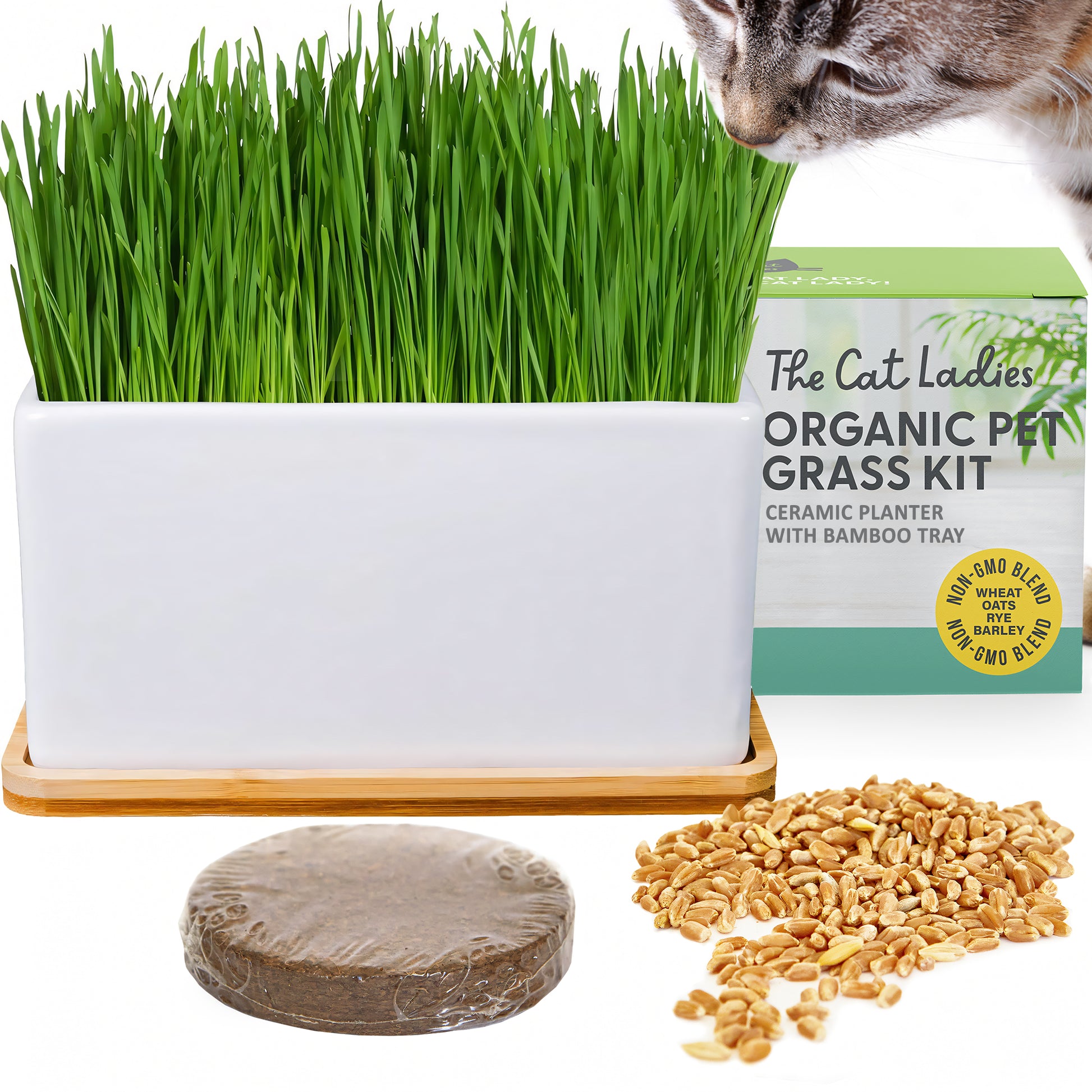 Elevate your cat's well-being and add a touch of charm to your home with our Cat Grass Seed Starter Kit (Ceramic Planter with Bamboo Tray). More than a planter, it's a delightful gift for cat moms, a source of hairball control, and a tasteful treat for your feline friends.